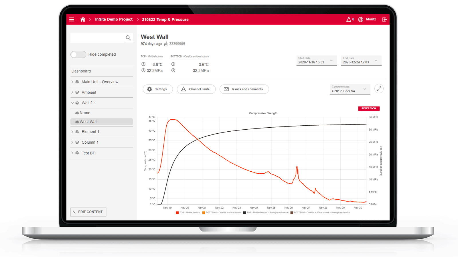 Monitor sensor data in real time, analyze it intuitively, and receive alerts for critical or desired concrete conditions.